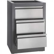 Two drawers on roller slides, accompanied by a ‘dummy’ third drawer, suitable for installation of a sink or sidebuner stainless steel drawer fronts, adjustable levelling feet. Supplied fully assembled.